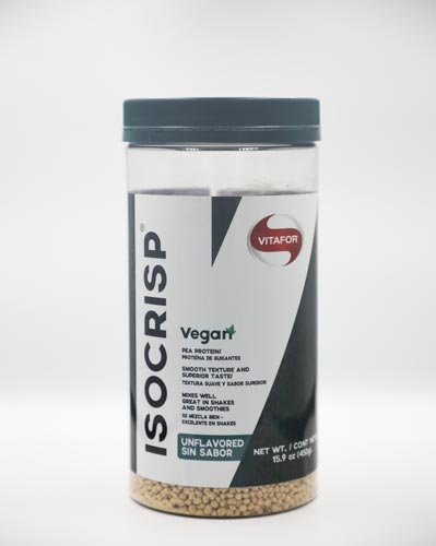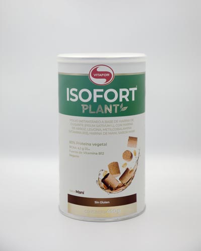 Suplemento nutricional que contiene una combinación de proteínas vegetales, incluyendo proteína aislada de arveja y harina de arroz.
